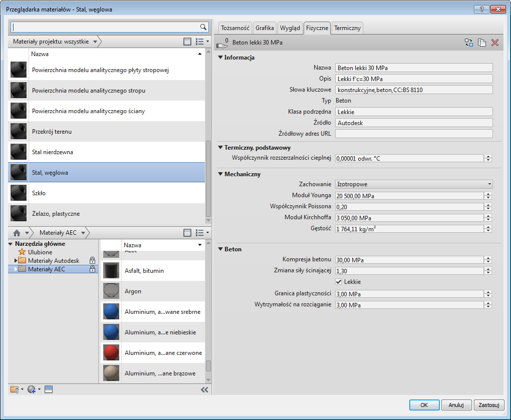 Biblioteki dostarczone przez firmę Autodesk są zablokowane, na co wskazuje ikona blokady. Materiały w zablokowanej bibliotece nie mogą zostać nadpisane ani usunięte. Można kopiować materiały z zablokowanej biblioteki do niezablokowanych bibliotek utworzonych przez użytkownika, gdzie materiały mogą zostać nadpisane lub usunięte. Na poniższym rysunku biblioteka Materiały projektu AB jest niezablokowaną biblioteką użytkownika.