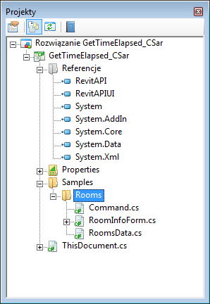 Poza środowiskiem IDE użyj Eksploratora Windows, aby przejść do folderów instalacyjnych programu Revit oraz wyszukać folder AppHookup. Zwróć uwagę, że w tym położeniu \Samples\Roomszostaną utworzone odpowiednie podfoldery.
