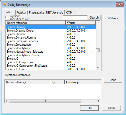 W oknie dialogowym Dodaj odniesienie znajdź i wybierz z listy System.Drawing i System.Windows.Forms. Aby wybrać wiele komponentów, przytrzymaj klawisz Ctrl. Przykładowo: