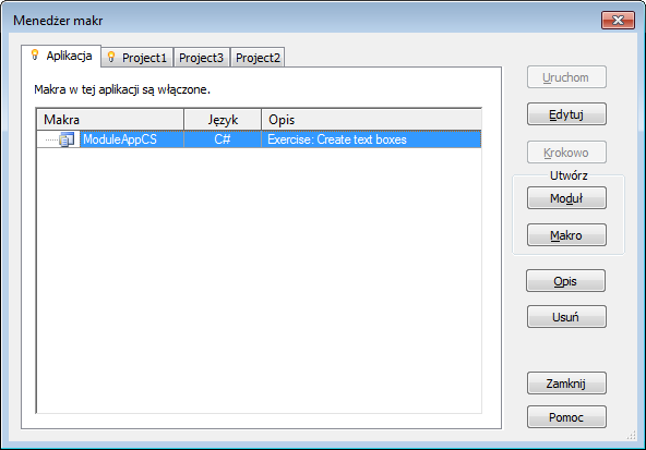 Uwaga: Jeśli aplikacja lub bieżący dokument zawiera już moduły, makra muszą być włączone w ustawieniach Bezpieczeństwo makr.