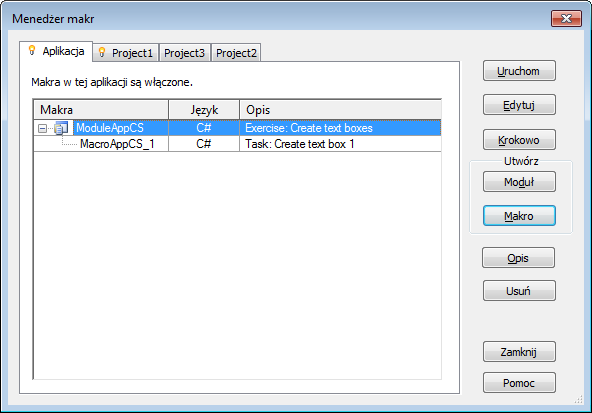 - W Menedżerze makr wybierz kartę Aplikacja (w przypadku makr poziomu aplikacji) lub kartę Projekt (w przypadku makr poziomu dokumentu), na której zostanie umieszczone makro.