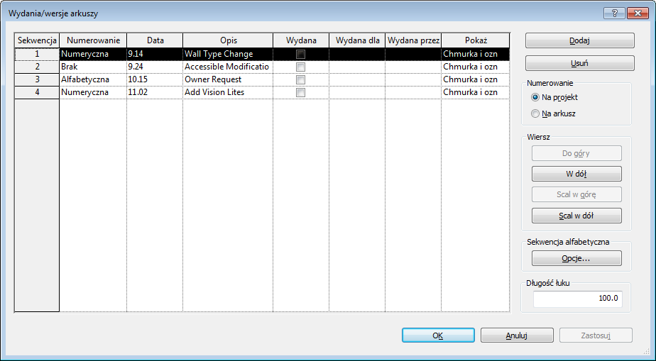 Program Revit może w różny sposób wyświetlać sekwencję zmian w projekcie. Można śledzić zmiany, korzystając z następujących schematów numeracji: