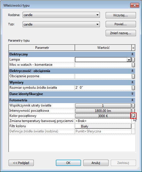 - W oknie dialogowym Parametry i kategoria rodziny w obszarze Parametry rodziny wybierz opcję Źródło światła.