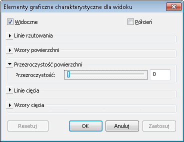 - Przezroczystość powierzchni: wyświetla linie tylko dla elementów, nie dla powierzchni. Użyj suwaka Przezroczystość, aby ustawić procent przezroczystości powierzchni.