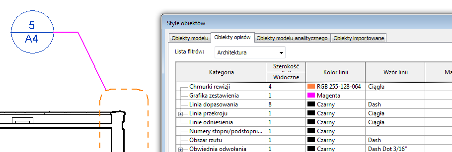Można sterować szerokością, kolorem oraz wzorem linii używanych w znacznikach odwołania i liniach odniesienia. Ustawienia określone w tym miejscu mają zastosowanie do wszystkich odwołań w projekcie.