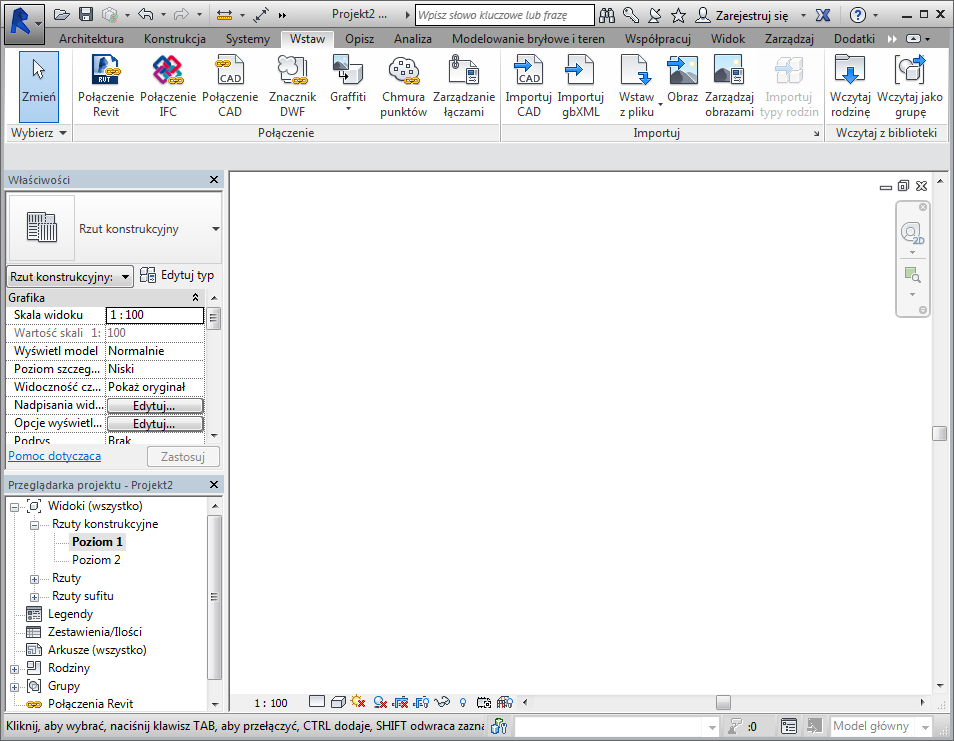 Obszar rysunku przedstawia widoki (oraz arkusze i zestawienia) bieżącego projektu. Widok otwierany w projekcie jest zawsze wyświetlany domyślnie w obszarze rysunku na wierzchu pozostałych otwartych widoków.
