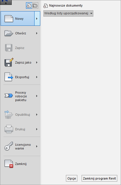 Kliknięcie przycisku Najnowsze dokumenty umieszczonego w menu aplikacji spowoduje wyświetlenie listy ostatnio otwartych plików. Za pomocą listy rozwijanej można zmienić porządek sortowania ostatnio używanych dokumentów. Pinezki umożliwiają trwałe pozostawianie dokumentów na liście, niezależnie od tego, kiedy były ostatnio otwierane.