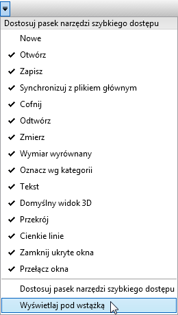 Pasek narzędzi szybkiego dostępu może być wyświetlany nad lub pod wstążką. Aby zmienić ustawienie, na pasku narzędzi Szybki dostęp kliknij kolejno listę rozwijaną Dostosuj pasek narzędzi Szybki dostęp