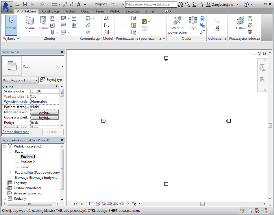 Obszar rysunku przedstawia widoki (oraz arkusze i zestawienia) bieżącego projektu. Widok otwierany w projekcie jest zawsze wyświetlany domyślnie w obszarze rysunku na wierzchu pozostałych otwartych widoków.