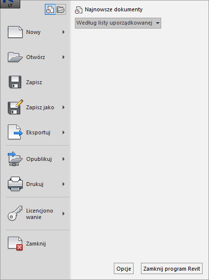 Kliknięcie przycisku Najnowsze dokumenty umieszczonego w menu aplikacji spowoduje wyświetlenie listy ostatnio otwartych plików. Za pomocą listy rozwijanej można zmienić porządek sortowania ostatnio używanych dokumentów. Pinezki umożliwiają trwałe pozostawianie dokumentów na liście, niezależnie od tego, kiedy były ostatnio otwierane.