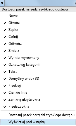 Jeśli z paska narzędzi szybkiego dostępu usunięto domyślne narzędzia, można je z powrotem dodać. W tym celu należy kliknąć menu rozwijane Dostosuj pasek narzędzi szybkiego dostępu i zaznaczyć wybrane narzędzie.