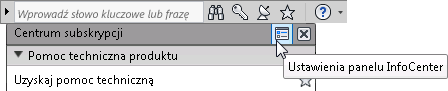 InfoCenter obejmuje zestaw narzędzi umieszczony po prawej stronie paska tytułu, umożliwiających uzyskanie dostępu do wielu źródeł informacji związanych z produktem.