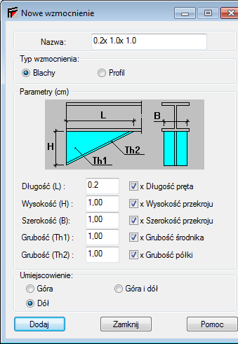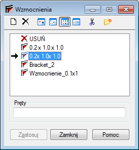 (Układy lokalne), aby wyświetlić lokalny układ współrzędnych prętów (jak pokazano poniżej), co umożliwia sprawdzenie początkowych współrzędnych prętów. Wzmocnienia są dodawane jedynie w początkowym węźle pręta podczas przypisywania go w oknie dialogowym.