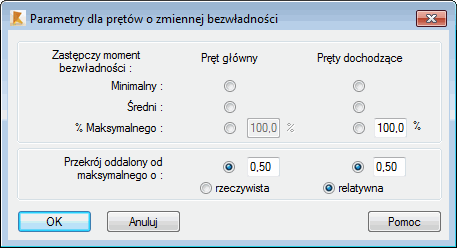 W tym oknie zdefiniowane mogą zostać zastępczy moment bezwładności zarówno dla pręta głównego, jak i dla prętów dochodzących, średni moment bezwładności pręta lub procent maksymalnego momentu bezwładności pręta.