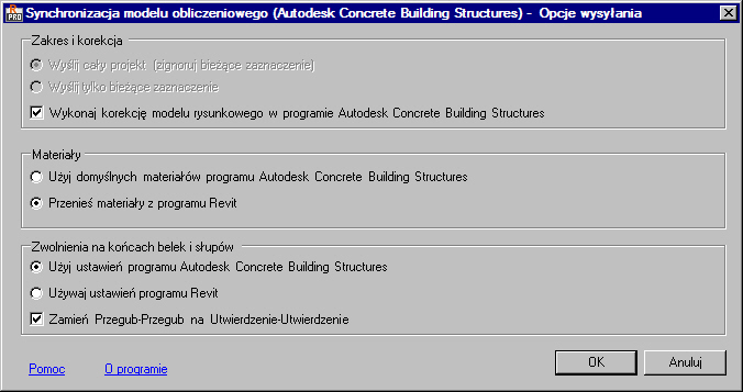 - W oknie dialogowym Synchronizacja modelu obliczeniowego (Autodesk Concrete Building Structures) — Opcje wysyłania określ opcje transferu: