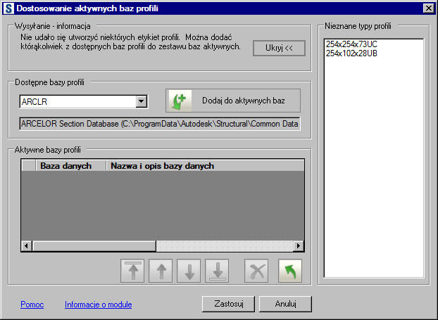 - Okno dialogowe Dostosowanie aktywnych baz profili programu Autodesk Concrete Building Structures jest otwierane tylko wtedy, gdy w trakcie połączenia pomiędzy programami Autodesk® Revit® i Autodesk CBS nazwy profili (zdefiniowane w programie Autodesk® Revit®) nie zostaną rozpoznane w bazie aktywnych profili programu Autodesk CBS.