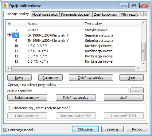 16. W oknie dialogowym Typ analizy zostaną wyświetlone dwa przypadki obciążenia dla kierunków X i Y i cztery kombinacje wygenerowane na ich podstawie, tak jak pokazano poniżej.
