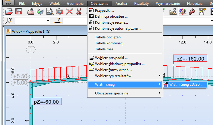 Aby zastosować nowe obciążenia, na pasku menu wybierz opcje Obciążenia > Obciążenia klimatyczne > Obciążenia klimatyczne 2D/3D (jak pokazano poniżej) lub na pasku narzędzi Obciążenia (zwykle po prawej stronie ekranu) kliknij przycisk (Obciążenia klimatyczne 2D/3D).