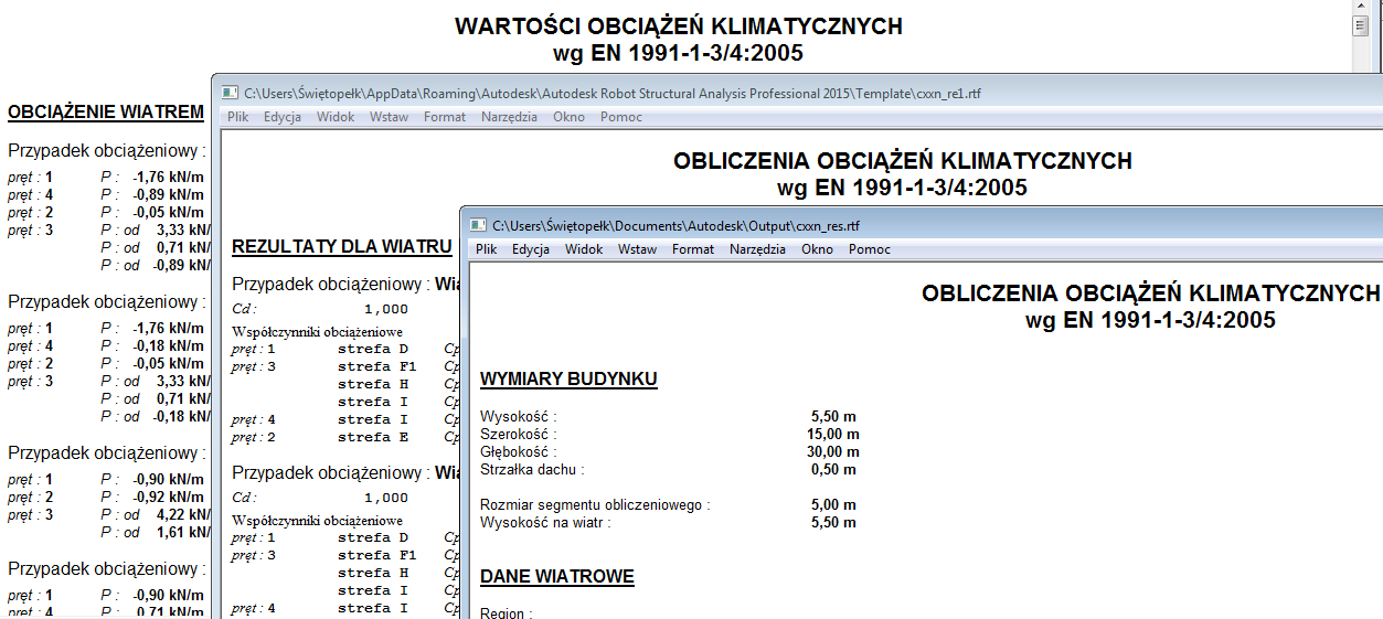 Otworzą się trzy okna zawierające różne notki obliczeniowe dla Obciążeń wiatrem, Wyników dla wiatru oraz Wymiarów konstrukcji i Dane wiatrowe, jak przedstawiono w części poniżej. Notki obliczeniowe umożliwiają sprawdzenie wszystkich parametrów obciążeń, które zostały wygenerowane.