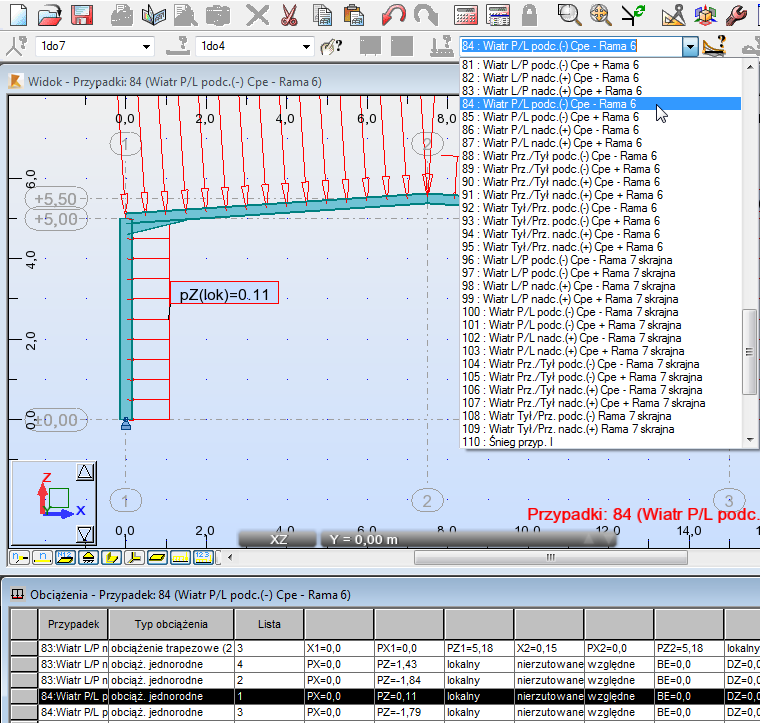 W oknie widoku zostaną wyświetlone wszystkie obciążenia. Aby wyświetlić każdy przypadek obciążenia w postaci graficznej, wybierz przypadek obciążenia z listy rozwijanej Przypadki, tak jak pokazano poniżej, lub podświetl Przypadki w oknie dialogowym Obciążenia — przypadek.