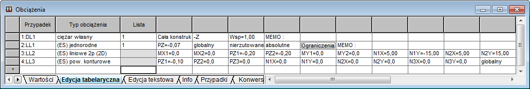 Wskazówka: Aby zmodyfikować zdefiniowane obciążenia, można użyć tabeli Obciążenia. Można na przykład zmienić typy obciążeń, listy elementów, w których obciążenia są stosowane i wartości tych obciążeń. Można także użyć tej tabeli, aby dodać do konstrukcji nowe obciążenia.