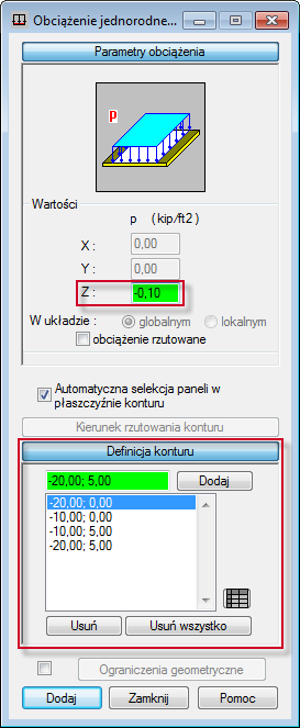 Przejdź do okna dialogowego Definicja obciążeń, a następnie na karcie Powierzchnia kliknij przycisk (Obciążenie powierzchniowe jednorodne na konturze).