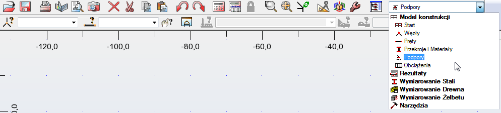 Na standardowym pasku narzędzi rozwiń menu Układy i wybierz opcję Podpory, jak pokazano poniżej, lub wybierz opcję Geometria > (Podpory).