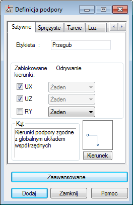 W oknie dialogowym Definicja podpory, na karcie Sztywne, upewnij się, że w polu Zablokowane kierunki są wybrane wartościUX i UZ , jak pokazano na rysunku poniżej.