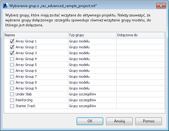 - Wybierz co najmniej jedną grupę do wczytania i kliknij przycisk OK, aby wczytać wystąpienie wybranych grup do bieżącego projektu programu Revit.