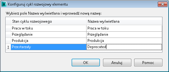 - W oknie dialogowym Konfiguruj cykl rozwojowy elementu wybierz z listy stan cyklu rozwojowego.