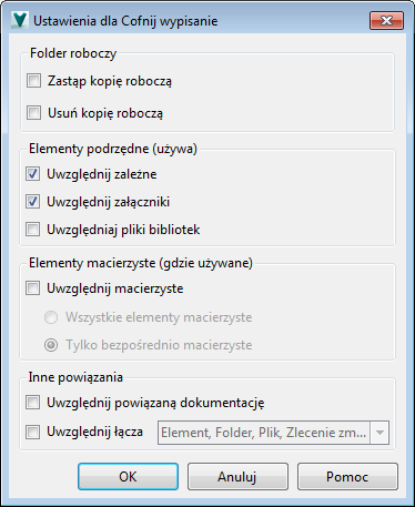 Przy wyłączaniu okna dialogowego Cofnij Wypisz, możesz określić wpływ odpowiednich operacji repozytorium na powiązane pliki. Polecenie Cofnij Wypisz jest wykonywane z określonymi ustawieniami bez wyświetlania monitów.