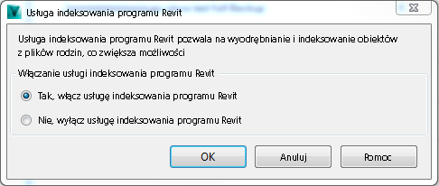 - W oknie dialogowym Usługa indeksowania programu Revit wybierz opcję Tak, włącz usługę indeksowania programu Revit.