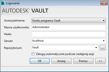 - Ta opcja jest dostępna tylko w programie Autodesk Vault Professional. W przypadku posiadania konta Microsoft Windows Active Directory można zalogować się do programu Autodesk Data Management Server, korzystając z poświadczeń konta użytkownika Microsoft Windows. Wybierz konto Windows z menu rozwijanego Uwierzytelnianie.