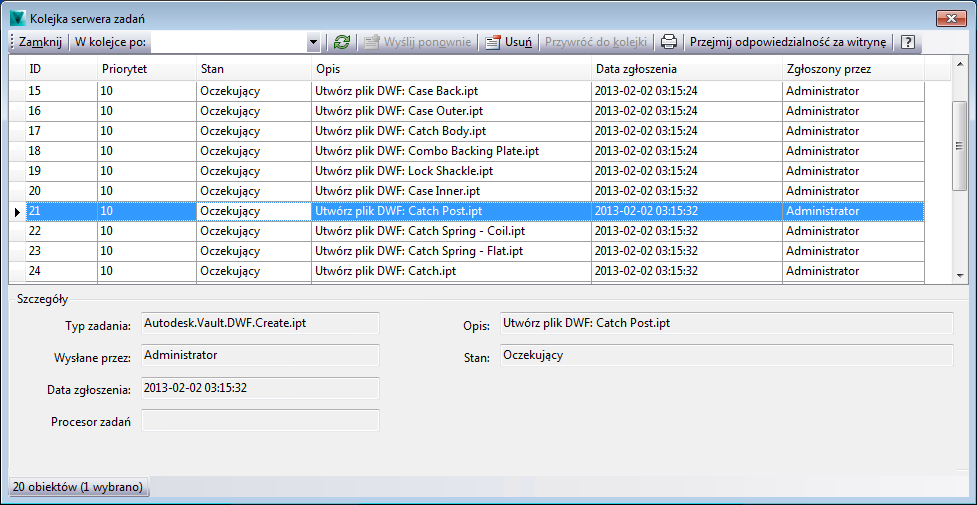 Kolejka serwera zadań jest listą zadań oczekujących na przetworzenie, czyli kolejką, a wysłanych ze strony klientów (Inventor, AutoCAD, Vault, Autoloader). Kolejka ta jest przechowywana na serwerze Vault i przez niego zarządzana.