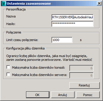 - Jeśli nastąpi przekroczenie limitu czasu połączenia między klientem repozytorium a serwerem Autodesk Vault Server przed przeniesieniem dużych plików, można zwiększyć limit czasu połączenia. Domyślnie jest to 1000 sekund. Wprowadź nową wartość limitu czasu.