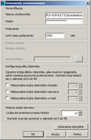 - W oknie dialogowym Ustawienia zaawansowane zmień nazwę użytkownika na MyDomain\AutodeskRemote i wprowadź odpowiednie hasło.