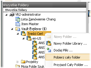 Można uniknąć ponownego tworzenia istniejących komponentów, wykonując operację pobierania całego folderu w kliencie Vault. Spowoduje to przesłanie folderu Content Center wraz ze wszystkimi komponentami, które zostały wpisane do repozytorium. Dotyczy to zarówno prywatnych, jak i współdzielonych folderów Content Center. W środowiskach, w których często są tworzone nowe elementy, korzystne może być regularne wykonywanie tej operacji.