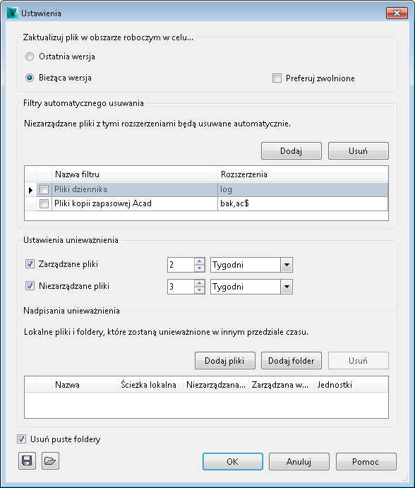 Można określić, które typy plików niezarządzane przez repozytorium są automatycznie usuwane z obszaru roboczego. Każdy plik w folderze roboczym z rozszerzeniem odpowiadającym rozszerzeniom zdefiniowanym zostanie usunięty podczas synchronizacji. Dwa filtry są dostarczone i domyślnie wyłączone: pliki dziennika (.log) oraz kopie zapasowe (.bak, ac$).
