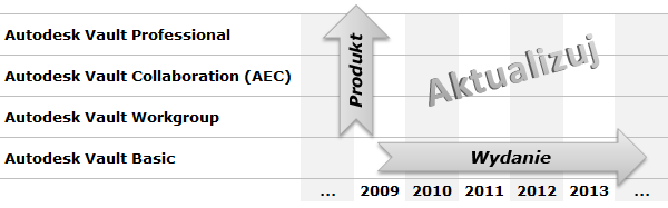 Ten proces uaktualniania dotyczy wszystkich wersji produktów Autodesk Vault. Poniższe szczegóły dotyczą wydania 2009 i nowszych, jednakże ogólny proces można zastosować do wszystkich wydań. Uaktualnienie może oznaczać nowsze wydanie, nowszą wersję produktu lub jedno i drugie. Podczas uaktualniania należy najpierw uaktualnić produkt do najnowszego wydania, a następnie uaktualnić jego wersję.