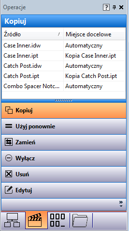 Panel Operacje pozwala sprawdzić, które operacje są przypisane do wykonania na plikach w widoku głównym. Po skonfigurowaniu plików w widoku głównym można użyć panelu Operacje, aby wyfiltrować pliki na podstawie przypisanej do nich operacji. Przypisane operacje: skopiowany, użyty ponownie, zastąpiony wykluczone, lub edytowany. Użyj panelu Operacje, aby sprawdzić konfigurację narzędzia Copy Design w widoku głównym i wprowadzić niezbędne zmiany. Uwaga: Można również ustawić operacje, przeciągając i upuszczając pliki z głównej siatki na wybrany przycisk operacji w panelu Operacje.