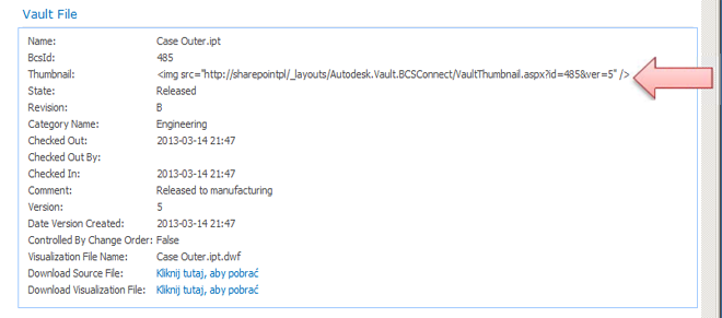 Gdy zostanie wywołane polecenie Utwórz/uaktualnij w odniesieniu do pliku AdskVaultFile (pokazano poniżej), strony profilu zostaną nadpisane i miniatury mogą nie być wyświetlane poprawnie. Aby przywrócić poprawne wyświetlanie miniatur, należy ręcznie zaktualizować XSL strony profilu. Istnieje kilka metod uzyskiwania aktualizacji. Wszystkie metody wymagają znajomości stron profilu i konfiguracji XSL. Proces opisany poniżej wymaga programu Microsoft SharePoint Designer 2010, który jest udostępniany online przez firmę Microsoft.