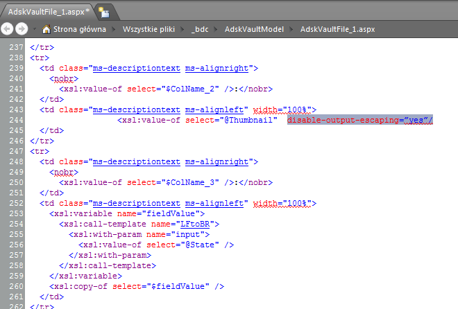disable-output-escaping=”yes”po ciągu „@Thumbnail” w wierszu, który nie został usunięty.