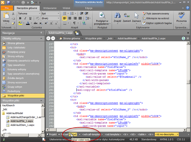 W przypadku wybrania opcji ręcznego tworzenia listy programu SharePoint sięgającej do programu Vault należy zmodyfikować stronę aspx zawierającą tę listę. Należy skopiować i wkleić wyróżniony fragment przedstawiony poniżej.