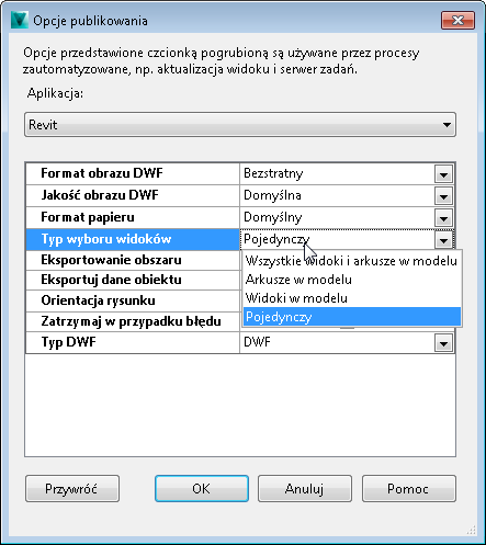 W poniższej tabeli opisano opcje publikowania dostępne w programie Revit.