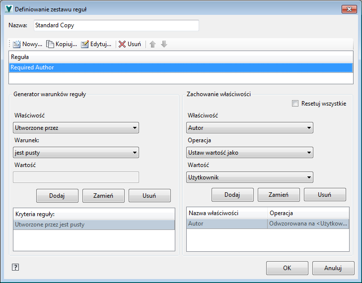Uwaga: Aby modyfikować reguły operacji należy być administratorem programu Vault.