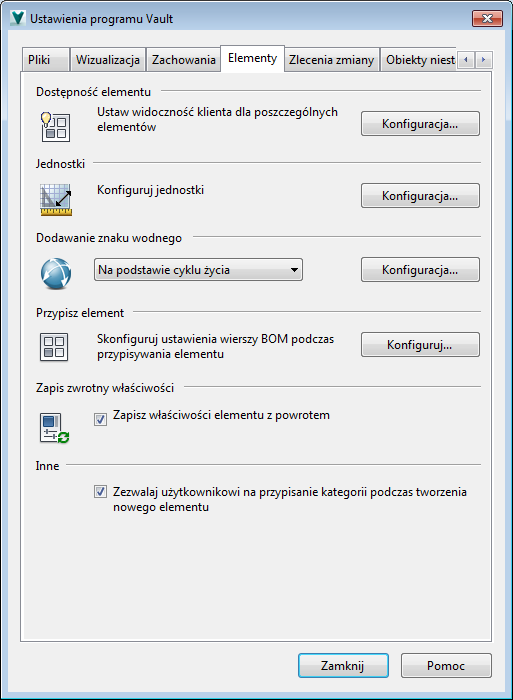 Karta Elementy zawiera opcje dotyczące konfiguracji zachowania elementów.