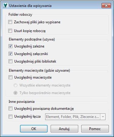 - Wybierz opcję Uwzględnij łącza, aby uwzględnić w operacji wpisywania połączone pliki lub pliki skojarzone z połączonym obiektem. Wybierz, które typy obiektów połączonych mają zostać uwzględnione z menu rozwijanego Uwzględnij łącza.