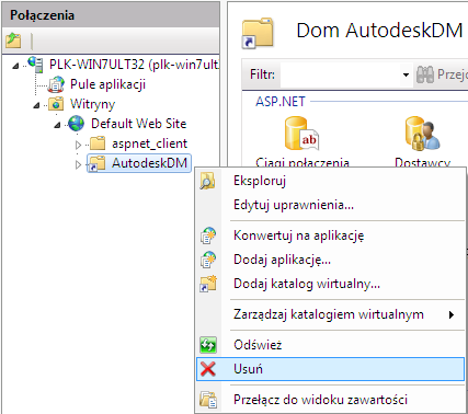Jeśli sprawdzenie istnienia wirtualnego katalogu "AutodeskDM" nie powiedzie się, oznacza to, że katalog nie istnieje. Błąd wskazuje, że poprzednia instalacja nie została poprawnie odinstalowana. Należy użyć narzędzi zarządzania IIS, aby zlokalizować i usunąć katalog wirtualny i skojarzone z nim katalogi.
