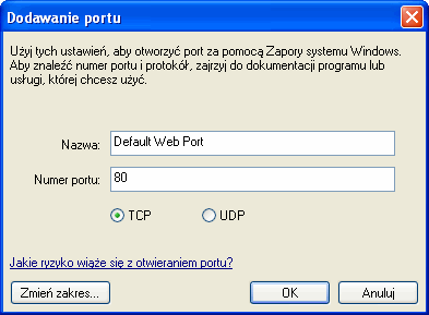 - W oknie dialogowym Protokół i porty wprowadź następujące informacje. Określone porty lokalne: 80