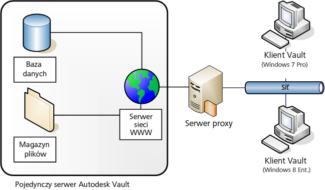 Serwer Autodesk Vault jest w rzeczywistości aplikacją WWW, która korzysta z usług w celu zarządzania komunikacją pomiędzy klientami a serwerem poprzez usługi WWW. Interakcja między klientami a serwerem przypomina komunikację przeglądarki internetowej z witryną WWW. W przypadku usług WWW wykorzystywany jest standardowy protokół HTTP i komunikacja przez port 80. W konfiguracjach z wieloma użytkownikami wymagane są usługi Microsoft IIS.